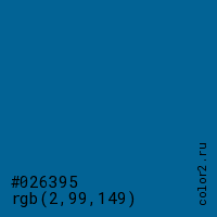 Цвет #026395 в цветовой модели RGB обозначается тремя октетами (2, 99, 149) в десятичном формате и #026395 в шестнадцатиричном (hex) формате, которые являются интенсивностью красного 2 (hex 02), интенсивность зелёного 99 (hex 63) и интенсивность синего 149 (hex 95).