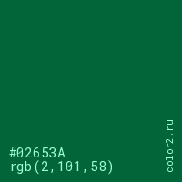 Цвет #02653A в цветовой модели RGB обозначается тремя октетами (2, 101, 58) в десятичном формате и #02653A в шестнадцатиричном (hex) формате, которые являются интенсивностью красного 2 (hex 02), интенсивность зелёного 101 (hex 65) и интенсивность синего 58 (hex 3A).
