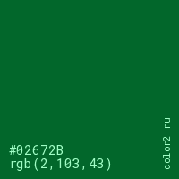 Цвет #02672B в цветовой модели RGB обозначается тремя октетами (2, 103, 43) в десятичном формате и #02672B в шестнадцатиричном (hex) формате, которые являются интенсивностью красного 2 (hex 02), интенсивность зелёного 103 (hex 67) и интенсивность синего 43 (hex 2B).