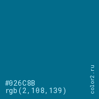 Цвет #026C8B в цветовой модели RGB обозначается тремя октетами (2, 108, 139) в десятичном формате и #026C8B в шестнадцатиричном (hex) формате, которые являются интенсивностью красного 2 (hex 02), интенсивность зелёного 108 (hex 6C) и интенсивность синего 139 (hex 8B).