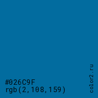 Цвет #026C9F в цветовой модели RGB обозначается тремя октетами (2, 108, 159) в десятичном формате и #026C9F в шестнадцатиричном (hex) формате, которые являются интенсивностью красного 2 (hex 02), интенсивность зелёного 108 (hex 6C) и интенсивность синего 159 (hex 9F).