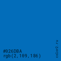 Цвет #026DBA в цветовой модели RGB обозначается тремя октетами (2, 109, 186) в десятичном формате и #026DBA в шестнадцатиричном (hex) формате, которые являются интенсивностью красного 2 (hex 02), интенсивность зелёного 109 (hex 6D) и интенсивность синего 186 (hex BA).