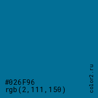 Цвет #026F96 в цветовой модели RGB обозначается тремя октетами (2, 111, 150) в десятичном формате и #026F96 в шестнадцатиричном (hex) формате, которые являются интенсивностью красного 2 (hex 02), интенсивность зелёного 111 (hex 6F) и интенсивность синего 150 (hex 96).