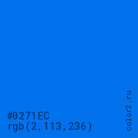 Цвет #0271EC в цветовой модели RGB обозначается тремя октетами (2, 113, 236) в десятичном формате и #0271EC в шестнадцатиричном (hex) формате, которые являются интенсивностью красного 2 (hex 02), интенсивность зелёного 113 (hex 71) и интенсивность синего 236 (hex EC).
