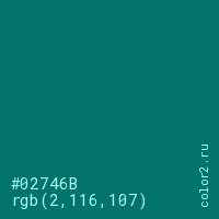 Цвет #02746B в цветовой модели RGB обозначается тремя октетами (2, 116, 107) в десятичном формате и #02746B в шестнадцатиричном (hex) формате, которые являются интенсивностью красного 2 (hex 02), интенсивность зелёного 116 (hex 74) и интенсивность синего 107 (hex 6B).