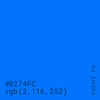 Цвет #0274FC в цветовой модели RGB обозначается тремя октетами (2, 116, 252) в десятичном формате и #0274FC в шестнадцатиричном (hex) формате, которые являются интенсивностью красного 2 (hex 02), интенсивность зелёного 116 (hex 74) и интенсивность синего 252 (hex FC).