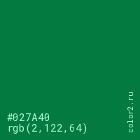 Цвет #027A40 в цветовой модели RGB обозначается тремя октетами (2, 122, 64) в десятичном формате и #027A40 в шестнадцатиричном (hex) формате, которые являются интенсивностью красного 2 (hex 02), интенсивность зелёного 122 (hex 7A) и интенсивность синего 64 (hex 40).