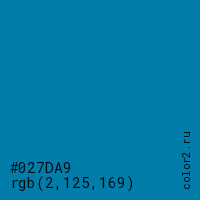 Цвет #027DA9 в цветовой модели RGB обозначается тремя октетами (2, 125, 169) в десятичном формате и #027DA9 в шестнадцатиричном (hex) формате, которые являются интенсивностью красного 2 (hex 02), интенсивность зелёного 125 (hex 7D) и интенсивность синего 169 (hex A9).