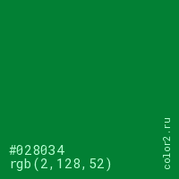 Цвет #028034 в цветовой модели RGB обозначается тремя октетами (2, 128, 52) в десятичном формате и #028034 в шестнадцатиричном (hex) формате, которые являются интенсивностью красного 2 (hex 02), интенсивность зелёного 128 (hex 80) и интенсивность синего 52 (hex 34).