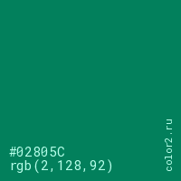 Цвет #02805C в цветовой модели RGB обозначается тремя октетами (2, 128, 92) в десятичном формате и #02805C в шестнадцатиричном (hex) формате, которые являются интенсивностью красного 2 (hex 02), интенсивность зелёного 128 (hex 80) и интенсивность синего 92 (hex 5C).