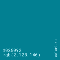 Цвет #028092 в цветовой модели RGB обозначается тремя октетами (2, 128, 146) в десятичном формате и #028092 в шестнадцатиричном (hex) формате, которые являются интенсивностью красного 2 (hex 02), интенсивность зелёного 128 (hex 80) и интенсивность синего 146 (hex 92).