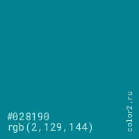 Цвет #028190 в цветовой модели RGB обозначается тремя октетами (2, 129, 144) в десятичном формате и #028190 в шестнадцатиричном (hex) формате, которые являются интенсивностью красного 2 (hex 02), интенсивность зелёного 129 (hex 81) и интенсивность синего 144 (hex 90).
