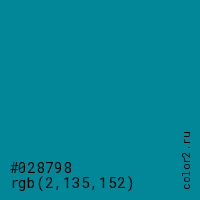 Цвет #028798 в цветовой модели RGB обозначается тремя октетами (2, 135, 152) в десятичном формате и #028798 в шестнадцатиричном (hex) формате, которые являются интенсивностью красного 2 (hex 02), интенсивность зелёного 135 (hex 87) и интенсивность синего 152 (hex 98).