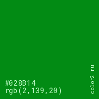 Цвет #028B14 в цветовой модели RGB обозначается тремя октетами (2, 139, 20) в десятичном формате и #028B14 в шестнадцатиричном (hex) формате, которые являются интенсивностью красного 2 (hex 02), интенсивность зелёного 139 (hex 8B) и интенсивность синего 20 (hex 14).