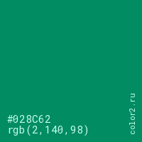 Цвет #028C62 в цветовой модели RGB обозначается тремя октетами (2, 140, 98) в десятичном формате и #028C62 в шестнадцатиричном (hex) формате, которые являются интенсивностью красного 2 (hex 02), интенсивность зелёного 140 (hex 8C) и интенсивность синего 98 (hex 62).