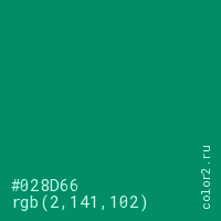 Цвет #028D66 в цветовой модели RGB обозначается тремя октетами (2, 141, 102) в десятичном формате и #028D66 в шестнадцатиричном (hex) формате, которые являются интенсивностью красного 2 (hex 02), интенсивность зелёного 141 (hex 8D) и интенсивность синего 102 (hex 66).