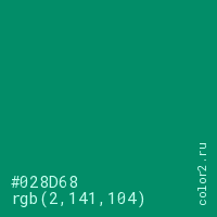 Цвет #028D68 в цветовой модели RGB обозначается тремя октетами (2, 141, 104) в десятичном формате и #028D68 в шестнадцатиричном (hex) формате, которые являются интенсивностью красного 2 (hex 02), интенсивность зелёного 141 (hex 8D) и интенсивность синего 104 (hex 68).