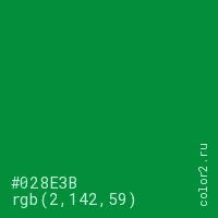 Цвет #028E3B в цветовой модели RGB обозначается тремя октетами (2, 142, 59) в десятичном формате и #028E3B в шестнадцатиричном (hex) формате, которые являются интенсивностью красного 2 (hex 02), интенсивность зелёного 142 (hex 8E) и интенсивность синего 59 (hex 3B).