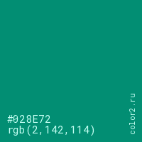 Цвет #028E72 в цветовой модели RGB обозначается тремя октетами (2, 142, 114) в десятичном формате и #028E72 в шестнадцатиричном (hex) формате, которые являются интенсивностью красного 2 (hex 02), интенсивность зелёного 142 (hex 8E) и интенсивность синего 114 (hex 72).
