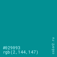 Цвет #029093 в цветовой модели RGB обозначается тремя октетами (2, 144, 147) в десятичном формате и #029093 в шестнадцатиричном (hex) формате, которые являются интенсивностью красного 2 (hex 02), интенсивность зелёного 144 (hex 90) и интенсивность синего 147 (hex 93).