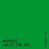 Цвет #029632 в цветовой модели RGB обозначается тремя октетами (2, 150, 50) в десятичном формате и #029632 в шестнадцатиричном (hex) формате, которые являются интенсивностью красного 2 (hex 02), интенсивность зелёного 150 (hex 96) и интенсивность синего 50 (hex 32).