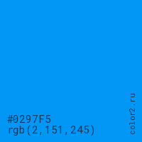 Цвет #0297F5 в цветовой модели RGB обозначается тремя октетами (2, 151, 245) в десятичном формате и #0297F5 в шестнадцатиричном (hex) формате, которые являются интенсивностью красного 2 (hex 02), интенсивность зелёного 151 (hex 97) и интенсивность синего 245 (hex F5).
