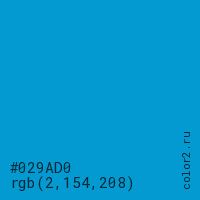 Цвет #029AD0 в цветовой модели RGB обозначается тремя октетами (2, 154, 208) в десятичном формате и #029AD0 в шестнадцатиричном (hex) формате, которые являются интенсивностью красного 2 (hex 02), интенсивность зелёного 154 (hex 9A) и интенсивность синего 208 (hex D0).
