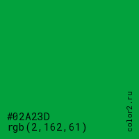 Цвет #02A23D в цветовой модели RGB обозначается тремя октетами (2, 162, 61) в десятичном формате и #02A23D в шестнадцатиричном (hex) формате, которые являются интенсивностью красного 2 (hex 02), интенсивность зелёного 162 (hex A2) и интенсивность синего 61 (hex 3D).