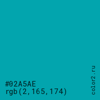 Цвет #02A5AE в цветовой модели RGB обозначается тремя октетами (2, 165, 174) в десятичном формате и #02A5AE в шестнадцатиричном (hex) формате, которые являются интенсивностью красного 2 (hex 02), интенсивность зелёного 165 (hex A5) и интенсивность синего 174 (hex AE).