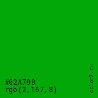 Цвет #02A708 в цветовой модели RGB обозначается тремя октетами (2, 167, 8) в десятичном формате и #02A708 в шестнадцатиричном (hex) формате, которые являются интенсивностью красного 2 (hex 02), интенсивность зелёного 167 (hex A7) и интенсивность синего 8 (hex 08).