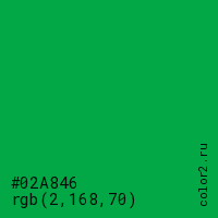 Цвет #02A846 в цветовой модели RGB обозначается тремя октетами (2, 168, 70) в десятичном формате и #02A846 в шестнадцатиричном (hex) формате, которые являются интенсивностью красного 2 (hex 02), интенсивность зелёного 168 (hex A8) и интенсивность синего 70 (hex 46).