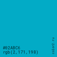 Цвет #02ABC6 в цветовой модели RGB обозначается тремя октетами (2, 171, 198) в десятичном формате и #02ABC6 в шестнадцатиричном (hex) формате, которые являются интенсивностью красного 2 (hex 02), интенсивность зелёного 171 (hex AB) и интенсивность синего 198 (hex C6).