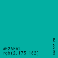 Цвет #02AFA2 в цветовой модели RGB обозначается тремя октетами (2, 175, 162) в десятичном формате и #02AFA2 в шестнадцатиричном (hex) формате, которые являются интенсивностью красного 2 (hex 02), интенсивность зелёного 175 (hex AF) и интенсивность синего 162 (hex A2).