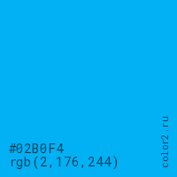Цвет #02B0F4 в цветовой модели RGB обозначается тремя октетами (2, 176, 244) в десятичном формате и #02B0F4 в шестнадцатиричном (hex) формате, которые являются интенсивностью красного 2 (hex 02), интенсивность зелёного 176 (hex B0) и интенсивность синего 244 (hex F4).