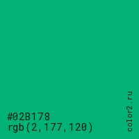 Цвет #02B178 в цветовой модели RGB обозначается тремя октетами (2, 177, 120) в десятичном формате и #02B178 в шестнадцатиричном (hex) формате, которые являются интенсивностью красного 2 (hex 02), интенсивность зелёного 177 (hex B1) и интенсивность синего 120 (hex 78).