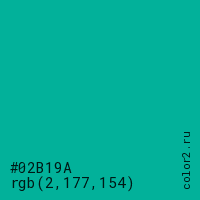Цвет #02B19A в цветовой модели RGB обозначается тремя октетами (2, 177, 154) в десятичном формате и #02B19A в шестнадцатиричном (hex) формате, которые являются интенсивностью красного 2 (hex 02), интенсивность зелёного 177 (hex B1) и интенсивность синего 154 (hex 9A).