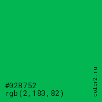 Цвет #02B752 в цветовой модели RGB обозначается тремя октетами (2, 183, 82) в десятичном формате и #02B752 в шестнадцатиричном (hex) формате, которые являются интенсивностью красного 2 (hex 02), интенсивность зелёного 183 (hex B7) и интенсивность синего 82 (hex 52).
