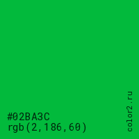 Цвет #02BA3C в цветовой модели RGB обозначается тремя октетами (2, 186, 60) в десятичном формате и #02BA3C в шестнадцатиричном (hex) формате, которые являются интенсивностью красного 2 (hex 02), интенсивность зелёного 186 (hex BA) и интенсивность синего 60 (hex 3C).