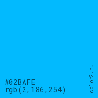 Цвет #02BAFE в цветовой модели RGB обозначается тремя октетами (2, 186, 254) в десятичном формате и #02BAFE в шестнадцатиричном (hex) формате, которые являются интенсивностью красного 2 (hex 02), интенсивность зелёного 186 (hex BA) и интенсивность синего 254 (hex FE).