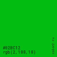 Цвет #02BC12 в цветовой модели RGB обозначается тремя октетами (2, 188, 18) в десятичном формате и #02BC12 в шестнадцатиричном (hex) формате, которые являются интенсивностью красного 2 (hex 02), интенсивность зелёного 188 (hex BC) и интенсивность синего 18 (hex 12).