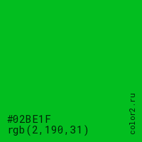 Цвет #02BE1F в цветовой модели RGB обозначается тремя октетами (2, 190, 31) в десятичном формате и #02BE1F в шестнадцатиричном (hex) формате, которые являются интенсивностью красного 2 (hex 02), интенсивность зелёного 190 (hex BE) и интенсивность синего 31 (hex 1F).