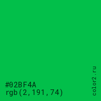 Цвет #02BF4A в цветовой модели RGB обозначается тремя октетами (2, 191, 74) в десятичном формате и #02BF4A в шестнадцатиричном (hex) формате, которые являются интенсивностью красного 2 (hex 02), интенсивность зелёного 191 (hex BF) и интенсивность синего 74 (hex 4A).