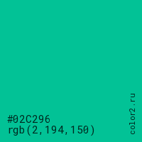 Цвет #02C296 в цветовой модели RGB обозначается тремя октетами (2, 194, 150) в десятичном формате и #02C296 в шестнадцатиричном (hex) формате, которые являются интенсивностью красного 2 (hex 02), интенсивность зелёного 194 (hex C2) и интенсивность синего 150 (hex 96).