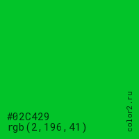 Цвет #02C429 в цветовой модели RGB обозначается тремя октетами (2, 196, 41) в десятичном формате и #02C429 в шестнадцатиричном (hex) формате, которые являются интенсивностью красного 2 (hex 02), интенсивность зелёного 196 (hex C4) и интенсивность синего 41 (hex 29).