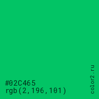 Цвет #02C465 в цветовой модели RGB обозначается тремя октетами (2, 196, 101) в десятичном формате и #02C465 в шестнадцатиричном (hex) формате, которые являются интенсивностью красного 2 (hex 02), интенсивность зелёного 196 (hex C4) и интенсивность синего 101 (hex 65).