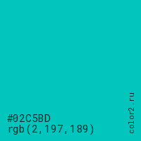 Цвет #02C5BD в цветовой модели RGB обозначается тремя октетами (2, 197, 189) в десятичном формате и #02C5BD в шестнадцатиричном (hex) формате, которые являются интенсивностью красного 2 (hex 02), интенсивность зелёного 197 (hex C5) и интенсивность синего 189 (hex BD).