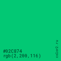 Цвет #02C874 в цветовой модели RGB обозначается тремя октетами (2, 200, 116) в десятичном формате и #02C874 в шестнадцатиричном (hex) формате, которые являются интенсивностью красного 2 (hex 02), интенсивность зелёного 200 (hex C8) и интенсивность синего 116 (hex 74).
