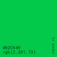 Цвет #02C949 в цветовой модели RGB обозначается тремя октетами (2, 201, 73) в десятичном формате и #02C949 в шестнадцатиричном (hex) формате, которые являются интенсивностью красного 2 (hex 02), интенсивность зелёного 201 (hex C9) и интенсивность синего 73 (hex 49).