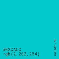 Цвет #02CACC в цветовой модели RGB обозначается тремя октетами (2, 202, 204) в десятичном формате и #02CACC в шестнадцатиричном (hex) формате, которые являются интенсивностью красного 2 (hex 02), интенсивность зелёного 202 (hex CA) и интенсивность синего 204 (hex CC).
