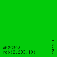 Цвет #02CB0A в цветовой модели RGB обозначается тремя октетами (2, 203, 10) в десятичном формате и #02CB0A в шестнадцатиричном (hex) формате, которые являются интенсивностью красного 2 (hex 02), интенсивность зелёного 203 (hex CB) и интенсивность синего 10 (hex 0A).